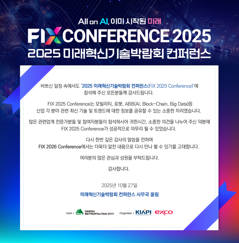 ‘2025 미래혁신기술 박람회 사무국’은 이용자에게 개별적인 맞춤서비스를 제공하기 위해 이용정보를 저장하고 수시로 불러오는 ‘쿠키(cookie)’를 사용하지 않습니다.